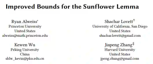 这篇最佳论文由吴克文与 Ryan Alweiss、Shachar Lovett、Jiapeng Zhang 合作完成,主题是「太阳花引理的改进」。