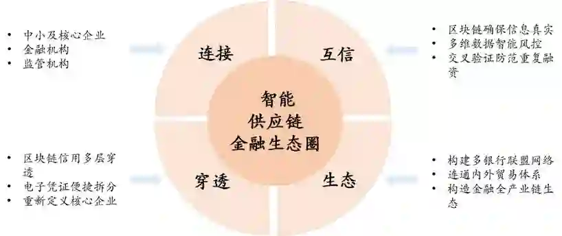 以金融科技驱动的智能供应链金融平台,具有智能在线连接多方打破信息孤岛、智能互信交叉多维验证确保链上企业资质与数据真实可信、智能穿透实现核心企业“信用流+资金流”多级分享和可控、智能生态实现不同企业供应链的跨链共享防范风险。依托这四大特点,构建起全新的智能供应链金融生态圈。