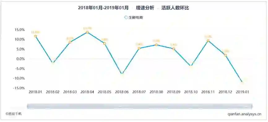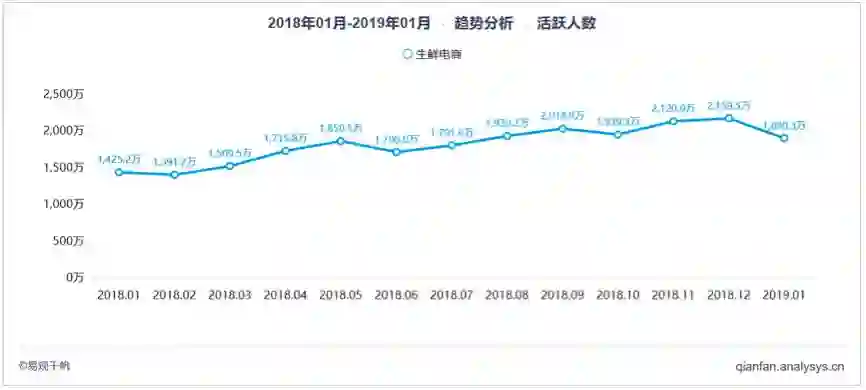 1月,移动购物领域进入调整期,生鲜电商也未能迎来新年的开门红,市场表现低迷。本月生鲜电商月度活跃人数,达到1890.3万的规模,环比下降12.5%,相比2018年1月1425.2万的月度活跃人数,同比增长32.6%,生鲜活跃用户得到持续渗透。