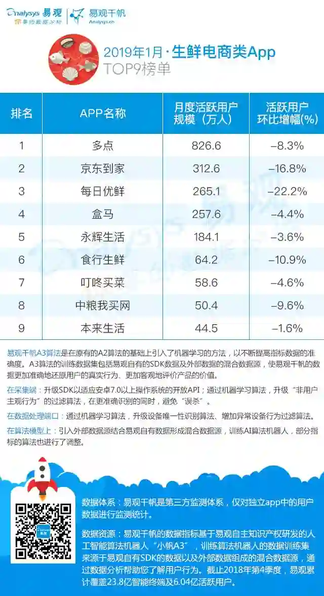在1月的生鲜电商App TOP榜单中,多点以826.6万活跃用户规模继续稳居榜首,环比下降8.3%;京东到家以312.6万活跃用户,位居第二位;每日优鲜本月月活下降较多,达到22.2%,活跃用户规模265.1万,位居第三。在新增用户粘性方面,多点凭次月留存率51.3%位居第一,食行生鲜、京东到家分别以46.8%、34.9%的次月留存率排在第二、第三位。