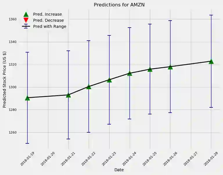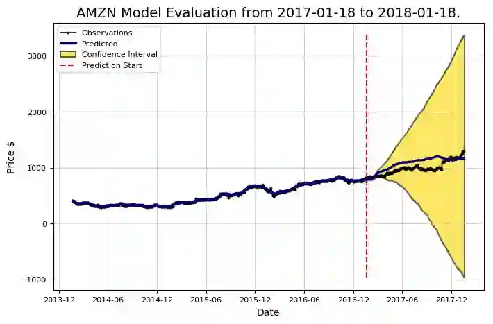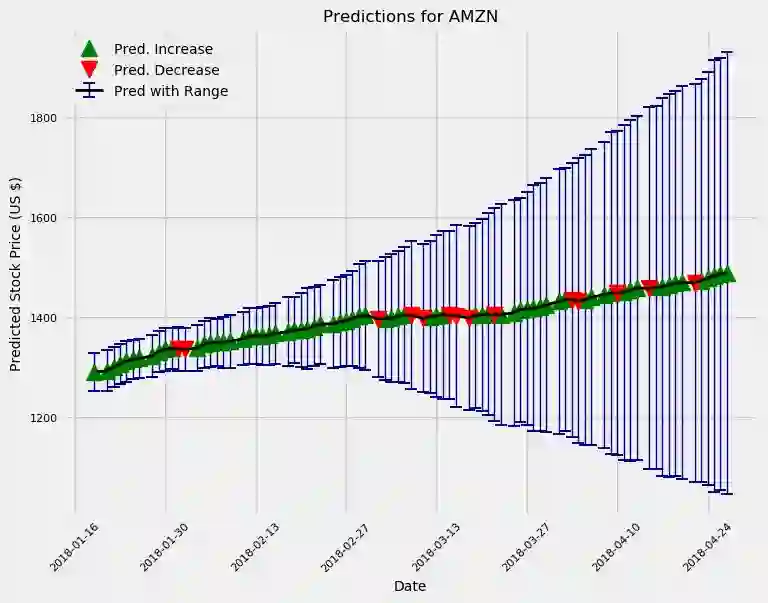 这个模型和大多数“专业人士”一样,总体上看好Amazon这支股票。另外,我们按照预期做出的估计,不确定性会进一步增加。实际上,如果我们使用这个模型策略进行交易,那我们每天都可以训练一个新的模型,并且提前预测最多一天的价格。