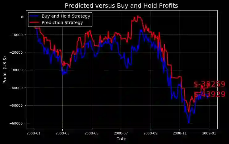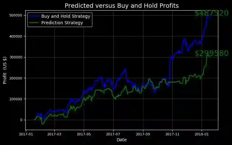 股票预测是一个有趣的实践,但真正的乐趣在于观察这些预测结果在实际市场中会发挥多好的作用。使用evaluate_prediction函数,我们可以在评估期间使用我们的模型“玩一玩”股票市场。我们将使用模型预测给出的策略,与我们在整个期间简单地购买和持有股票的策略进行一个对比。