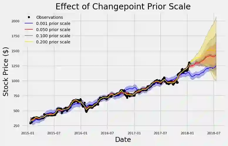 一个更高的先验能创造一个更多变点权重和更具弹性的模型,但这可能会导致过拟合,因为该模型将严格遵守训练数据的规律,而不能将它泛化到新的测试数据中。降低先验会减少模型的灵活性,而这又可能会导致相反的问题:欠拟合,当我们的模型没有完全遵循训练数据,而没有学习到底层模式时,这种情况就会发生。如何找出适当的参数以达到正确的平衡,这更多的是一个工程问题而不是理论问题,在这里,我们只能依靠经验结果。Stocker类有两种不同的方式来选择适当的先验:可视化和量化。 我们可以从可视化方法开始: