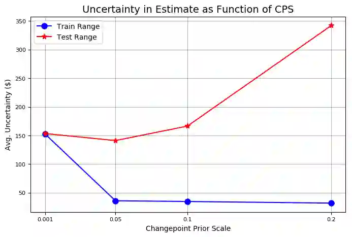 基于不同变点先验尺度下,训练和测试准确性曲线和不确定性曲线