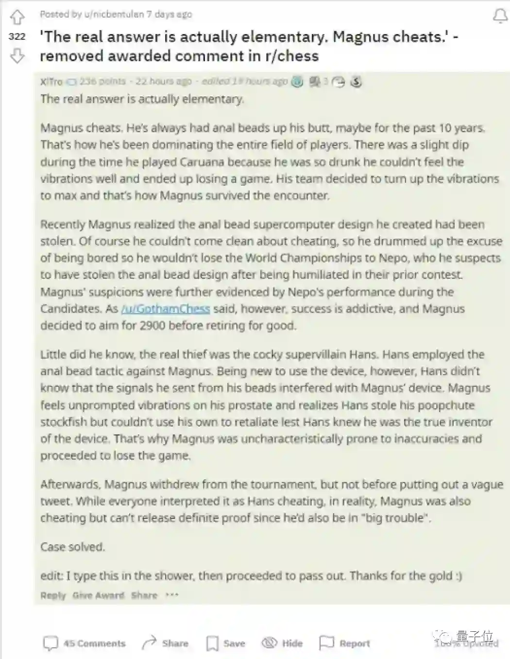 另一边,吃瓜网友们火速就位,不少国际象棋爱好者指出:“尼曼应该是用智能肛珠作弊”,于是乎这一说法瞬间在Reddit流传。