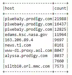 使用只包含 404 响应代码的日志记录 DataFrame,我们现在将打印出产生最多 404 错误的前 20 个主机的列表。记住,这些主机应该是按顺序排列的。