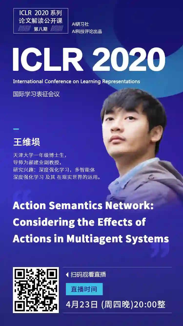 本次直播为【ICLR 2020 系列论文解读公开课】第八期,此论文录用为ICLR 2020 论文《 Action Semantics Network: Considering the Effects of Actions in Multiagent Systems》,我们有幸邀请到了天津大学王维埙博士,带来关于“动作语义网络,考虑多智能体系统中动作的影响”的分享。