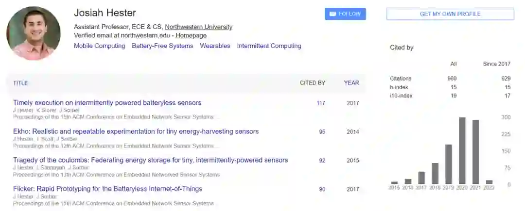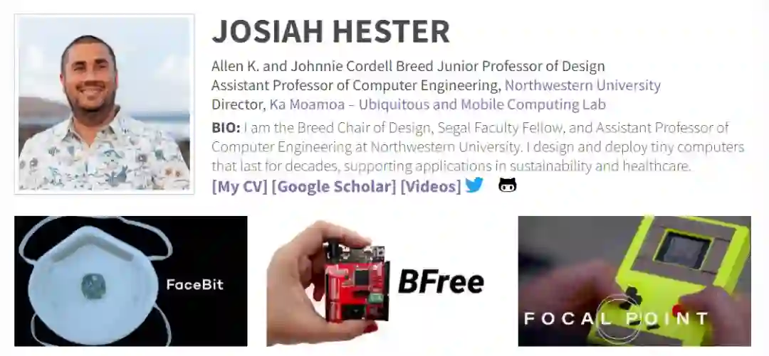 Josiah Hester,美国西北大学电气与计算机工程系助理教授,研究兴趣主要集中在:大规模可持续传感(从土壤中为传感器供电,建设可持续的网络基础设施);可穿戴健康设备(智能口罩、可穿戴相机和记录进食的设备)、低 / 无功耗交互系统(一个无电池的 Game Boy)等方面。他设计和部署的微型计算机可以使用几十年,支持可持续性和医疗保健领域的应用。前不久,他设计的可测量心率、呼吸频率的口罩得到了媒体的广泛报道。