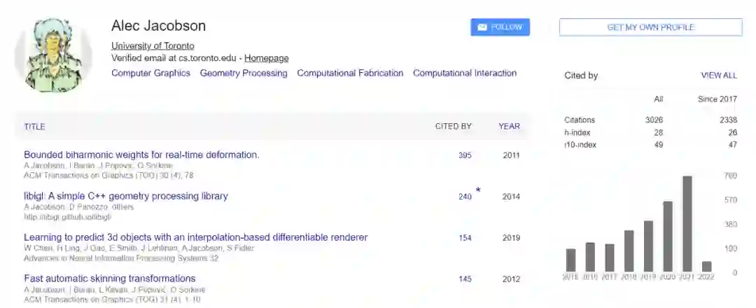 Alec Jacobson,多伦多大学计算机科学和数学系助理教授、Adobe 研究院高级研究科学家,他在苏黎世联邦理工学院获得计算机科学博士学位,师从 Olga Sorkine-Hornung 教授。他的工作涉及几何处理的各个方面,包括二维 / 三维几何的机器学习、基于物理的模拟、计算制造、几何能量和偏微分方程的数值方法,以及二维和三维的交互设计工具。他领导了广泛使用的几何处理库 libigl 的开发,该库获得了 2015 年的 SGP 软件奖。2020 年,他获得了 ACM SIGGRAPH 重要新研究员奖(Significant New Researcher Award)。