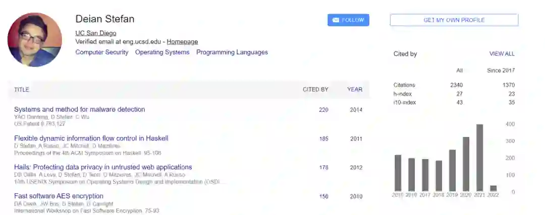 Deian Stefan,加州大学圣地亚哥分校计算机科学与工程系助理教授,网络安全初创公司 Intrinsic(被 VMWare 收购)的联合创始人和首席科学家。此前,他在斯坦福大学获得计算机科学博士学位。他主要对横跨安全性、编程语言和系统的研究感兴趣。