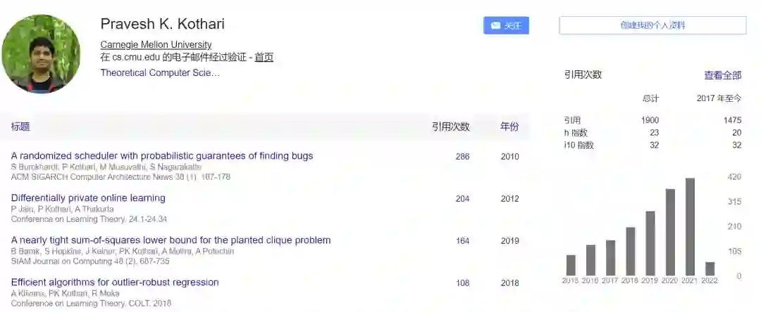 Pravesh K. Kothari,卡内基梅隆大学计算机科学系助理教授。他的研究旨在设计有效的算法,以支撑理论计算机科学,已为一系列论文中用于学习高维高斯混合的算法提高了效率。