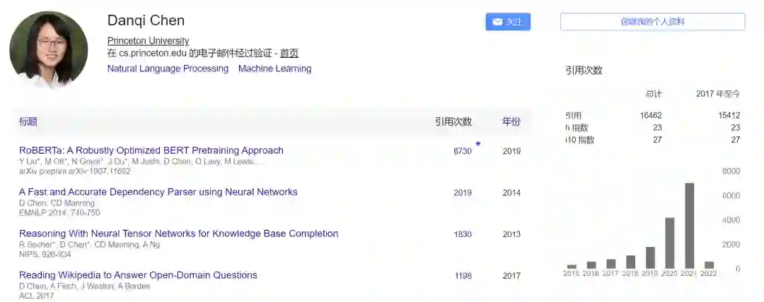 陈丹琦,普林斯顿大学计算机科学系助理教授,曾是 Facebook AI Research(FAIR)的访问科学家,在自然语言处理(NLP)领域取得了一系列的研究成果,还是 RoBERTa 的作者之一。