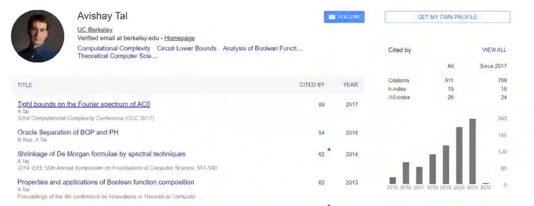 Avishay Tal,加州大学伯克利分校电子工程与计算机科学系助理教授,2015 年在魏茨曼科学研究所获得博士学位。他的研究兴趣主要集中在计算复杂度、布尔函数分析、伪随机、量子计算等方向。