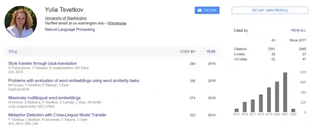 Yulia Tsvetkov,华盛顿大学 Paul G. Allen 计算机科学与工程学院助理教授,在 CMU 拿到博士学位。她主要研究自然语言处理,尤其是机器学习和理论或社会语言学交叉的混合解决方案。