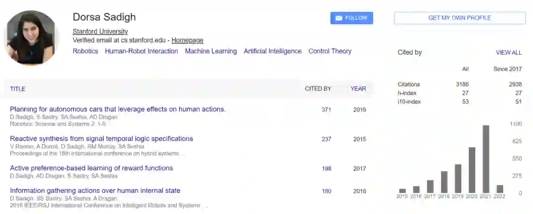 Dorsa Sadigh,斯坦福大学计算机科学系助理教授,博士毕业于加州大学伯克利分校电气工程与计算机科学系。Dorsa Sadigh 的研究兴趣是机器人技术、机器学习和控制理论的交叉领域,致力于为安全、可靠和自适应的人机交互以及多智能体交互开发高效算法。