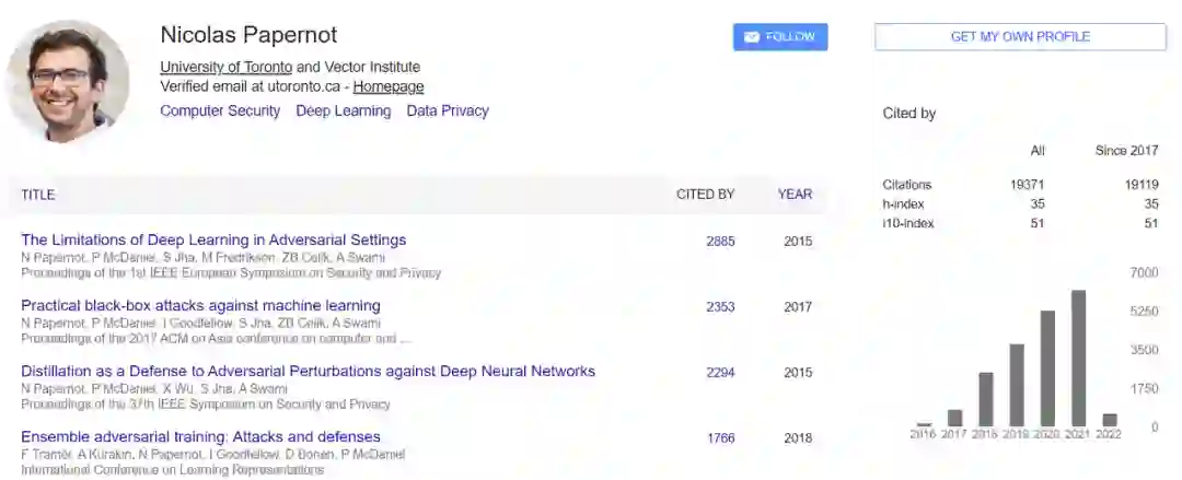 Nicolas Papernot,多伦多大学电气与计算机工程系助理教授,博士毕业于宾夕法尼亚州立大学计算机科学与工程专业。他的研究兴趣是安全、隐私和机器学习的交叉领域。Nicolas Papernot 还担任 IEEE 安全与隐私研讨会(S&P)的副主席。