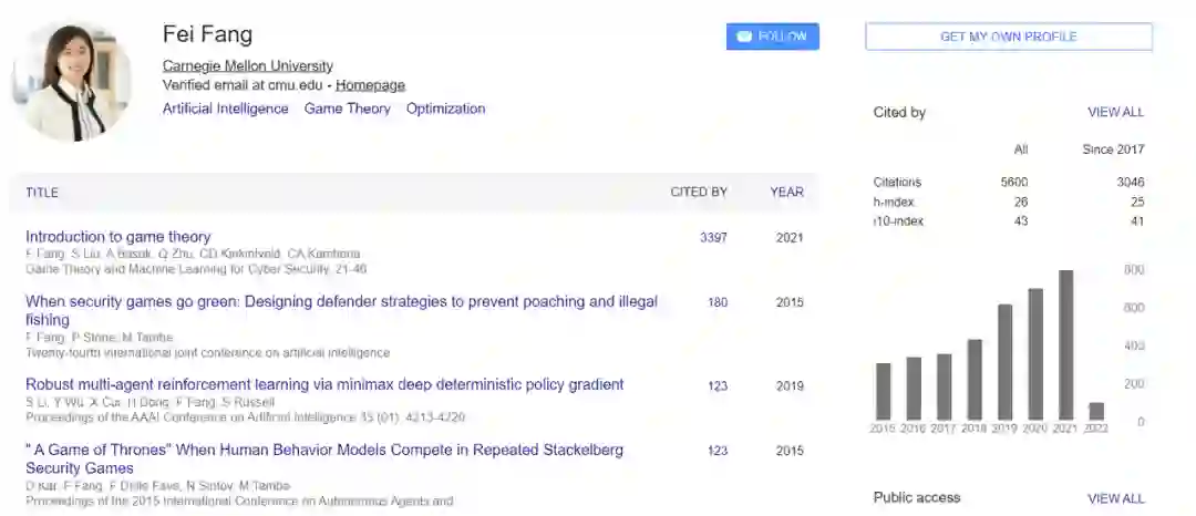 方飞,卡内基梅隆大学大学(CMU)计算机学院软件研究所助理教授,2021 年 IJCAI 计算机与思想奖的获得者。在加入 CMU 之前,她是哈佛大学的博士后研究员,2016 年她获得了南加州大学(USC)的博士学位。方飞的研究方向是人工智能和多智能体系统,致力于将机器学习与博弈论相结合。