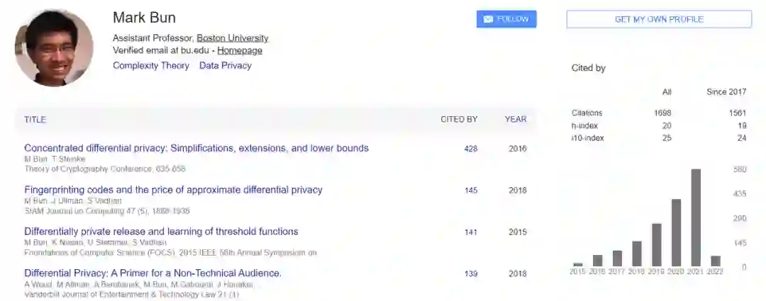 Mark Bun,波士顿大学助理教授,2016 年在哈佛大学取得计算机科学博士学位,师从 Salil Vadhan。他对理论计算机科学有广泛的兴趣,包括数据隐私、计算复杂性、密码学和机器学习基础。
