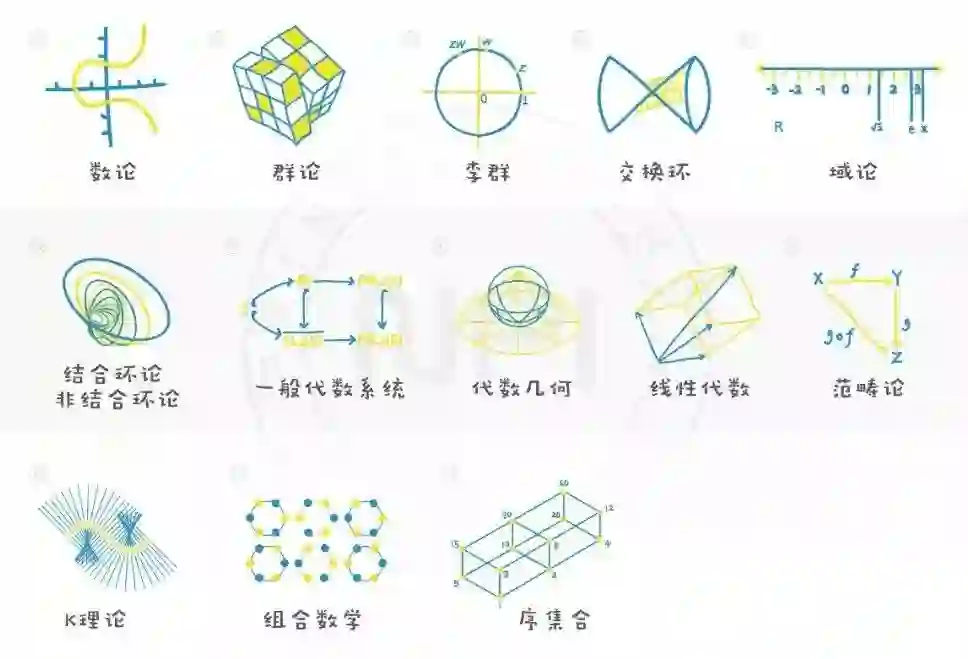 代数是对计数、算术、代数运算和对称性的一些关键的概念进行提炼而发展的。通常来说,这些领域仅通过几个公理就可定义它们的研究对象,然后再考虑这些对象的示例、结构和应用。其他非常偏代数的领域包括代数拓扑、信息与通信,以及数值分析。