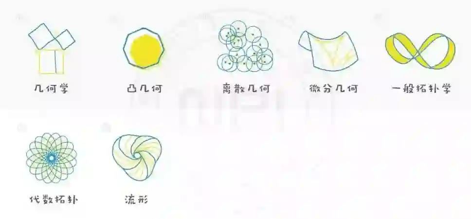 几何学是一门从多方面研究的学科。这一大块区域包括经典的欧几里德几何和非欧几何、解析几何、重合几何(包括射影平面)、度规性质(长度与角度),还有组合几何学——如从有限群论中出现的几何。
