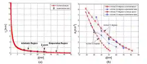 该团队根据微槽群毛细润湿及其流动特性,发展了微槽群毛细润湿及流动特性的理论模型,旨在揭示微槽群取热热沉微流动机理及其与复合相变强化传热的内在联系。由于毛细压力梯度的逐渐变化使得曲率半径连续变化,该模型建立了液膜厚度和微槽几何结构尺寸的普适关系(图1),数值分析了微槽群内液体工质沿轴向润湿长度、润湿面积随微槽几何尺寸、与竖直方向倾角及固液接触角等的变化影响规律,微槽内液膜曲率半径、液体流速随倾角变化沿润湿长度方向的影响规律。结果表明:数值计算结果与实验结果具有一致性(图2);液膜的曲率半径和润湿面积随轴向方向逐渐减小,在最大润湿长度(干涸点)位置趋近于0;液体润湿面积随倾角和固液接触角的增大而减小;较小的微槽尺寸能使液体产生更长的润湿长度;由于毛细压力沿轴向方向的变化,微槽内液膜流速先增大,后减小,在最大润湿高度上,随着水力半径逐渐减小,流阻增大,流速为0(图3)。在相同热流下,微槽内液体的流速随倾角的增大而减小。上述成果已在国际传热学术期刊APPLED THERMAL ENGINEERING 上发表,该成果为大功率高功率密度LED微槽群热管理系统的应用设计提供了理论支撑。