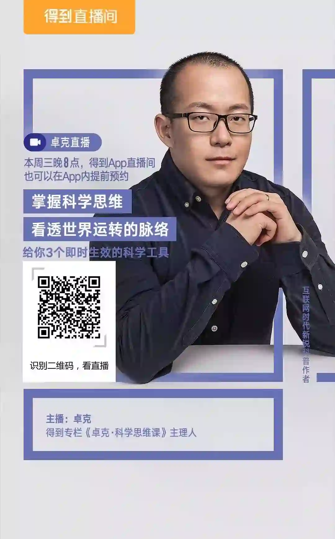 通过本周三20:00得到直播间,《卓克•科学思维课》的主理人卓克会带你: