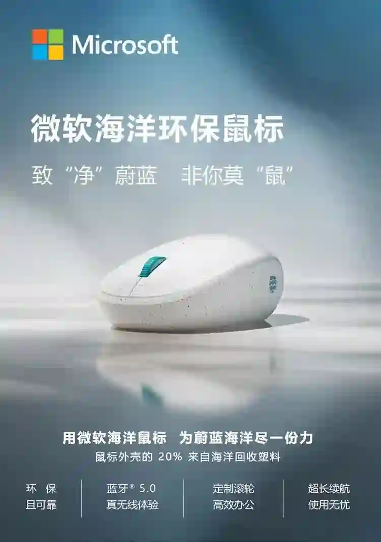 据微软中国官方消息,微软海洋环保鼠标今日正式上市。这款产品外壳的 20% 由回收海洋塑料制成,相当于半个约 450 毫升的水瓶。包装不含塑料,由木材和天然甘蔗纤维制成,100% 可回收。该款鼠标集具备环保、无线连接、定制滚轮、超长续航等优点于一身,售价为 199 元。