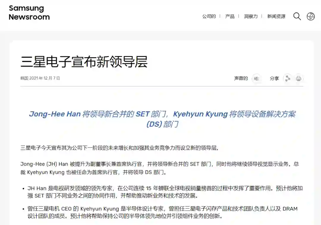 今日,三星电子通过官方网站宣布公司将合并移动和消费电子部门,并进行了一系列的人事改组。三星正把业务重点放在不断增长的逻辑芯片业务上。三星提拔视觉显示业务主管 Jong-Hee Han 为副会长兼联席 CEO,领导由移动和消费电子业务合并的新部门;提拔三星电机 CEO Kyehyun Kyung 为联席 CEO,领导芯片和组件部门。三星电子表示,新任命是“为了公司未来增长的下一阶段并加强其业务竞争力”。