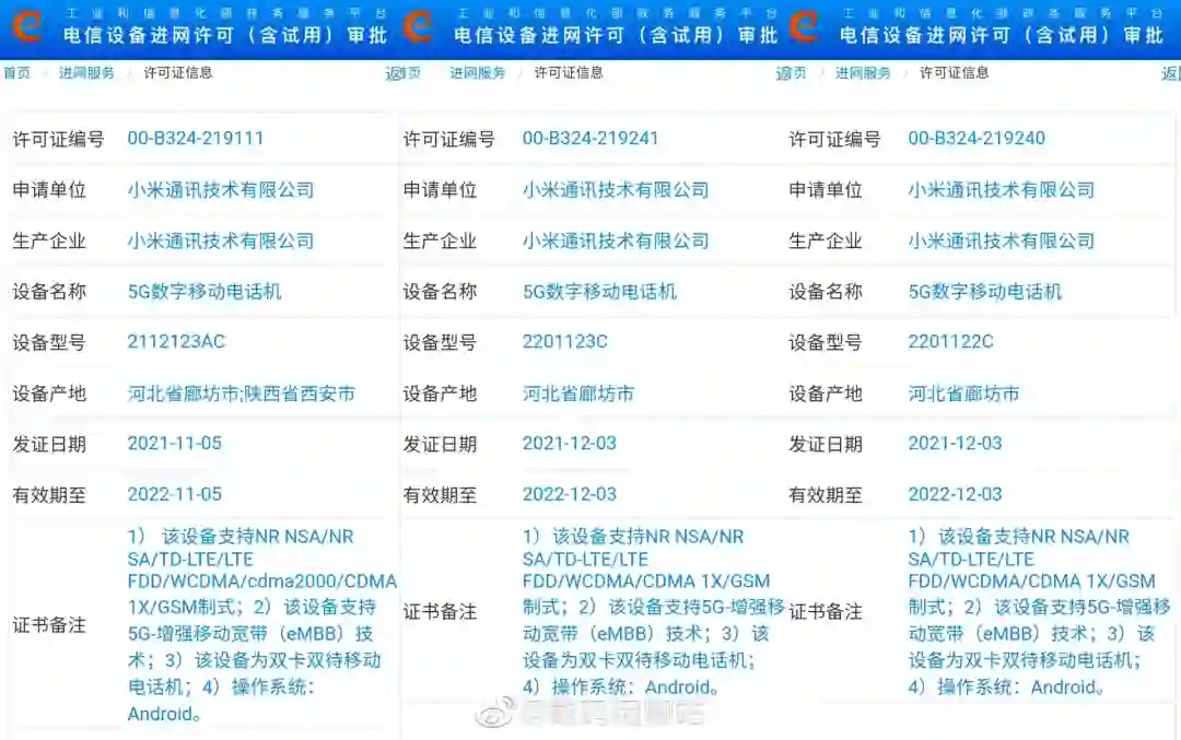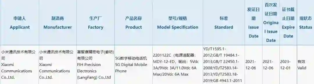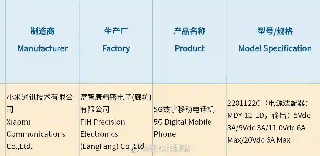 据最新消息显示,小米 12 系列首发 3 款手机已经入网,其中小米 12 型号为 2201123C,小米 12 Pro 型号为 2201122C,小米 12X 型号为 2112123AC。今日 3C 页面的充电器认证信息显示,型号为 2201122C 的小米 12 Pro 已通过认证,并且确认支持 20V 6A 120W 快充。