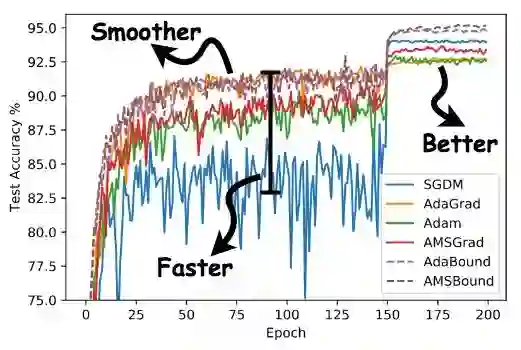 AdaBound是最近一篇论文[5]中提到的,按照作者的说法,AdaBound会让你的训练过程像adam一样快,并且像SGD一样好。