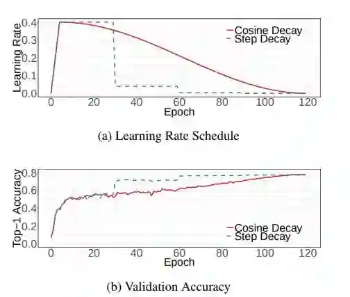 下面是带有warmup的学习率衰减的可视化图[4]。其中,图(a)是学习率随epoch增大而下降的图,可以看出cosine decay比step decay更加平滑一点。图(b)是准确率随epoch的变化图,两者最终的准确率没有太大差别,不过cosine decay的学习过程更加平滑。