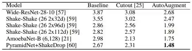 数据增强在图像分类问题上有很重要的作用,但是增强的方法有很多,并非一股脑地用上所有的方法就是最好的。那么,如何选择最佳的数据增强方法呢? AutoAugment[11]就是一种搜索适合当前问题的数据增强方法的方法。该方法创建一个数据增强策略的搜索空间,利用搜索算法选取适合特定数据集的数据增强策略。此外,从一个数据集中学到的策略能够很好地迁移到其它相似的数据集上。