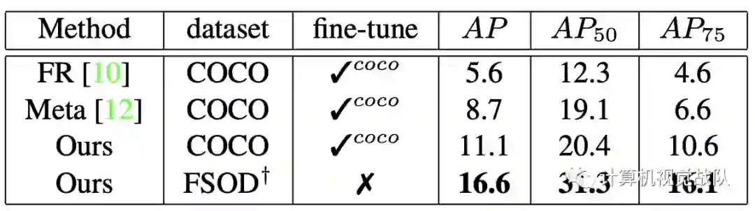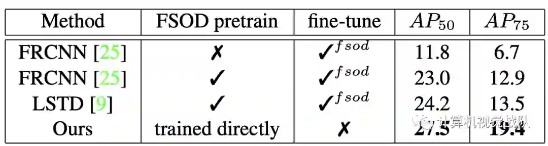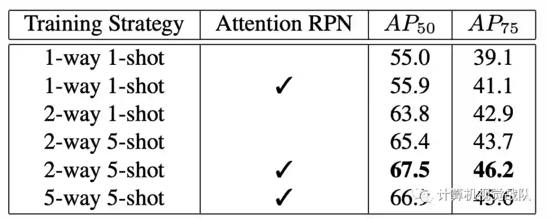 上表进一步比较了在不同训练策略下具有注意力RPN的模型和具有常规RPN的模型。在AP50和AP75评估中,注意力RPN的模型始终表现出比常规RPN更好的性能。在AP50 / AP75评估中,注意力RPN在1-way 1-shot训练策略中产生0.9%/ 2.0%的收益,在2-way 5-shot训练策略中产生2.0%/ 2.1%的收益。这些结果证实,我们注意力的RPN会产生更好的建议并有益于最终的检测预测。因此,在我们的完整模型中采用了注意力RPN。