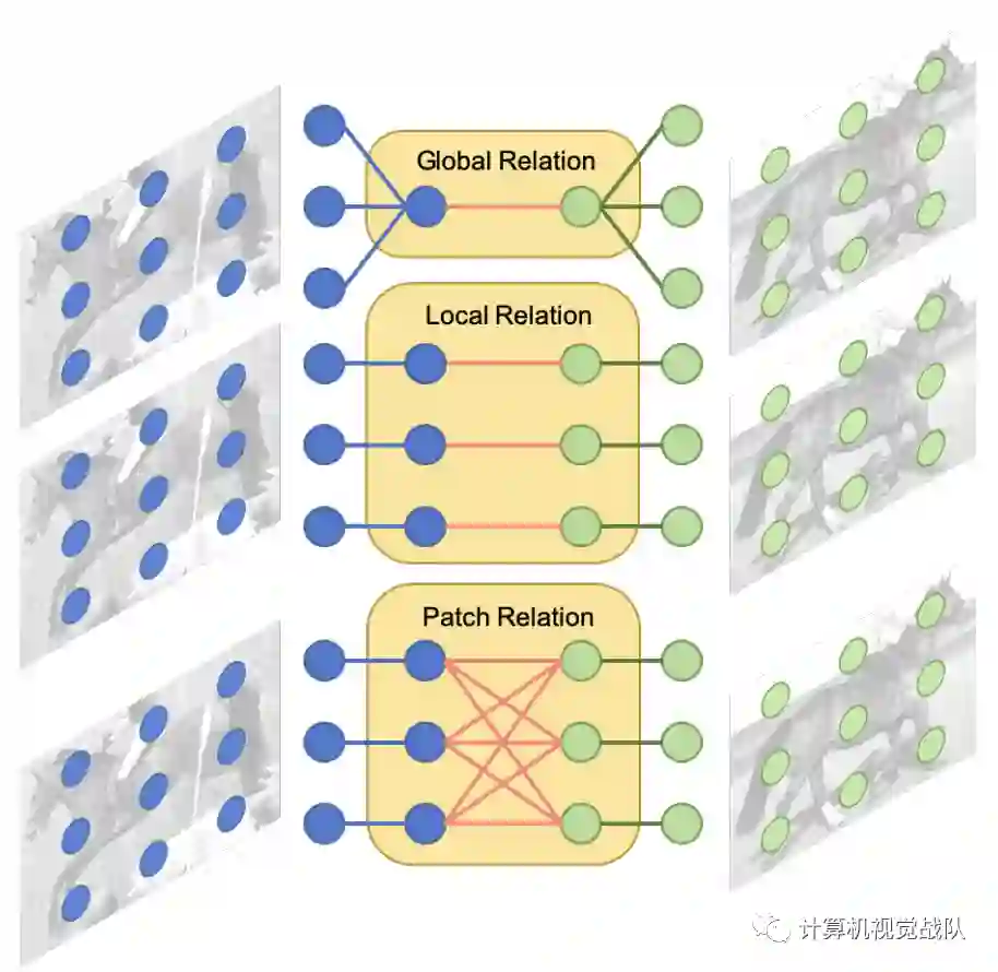 不同的关系模块建模查询和支持图像之间的不同关系。全局关系模块使用全局表示来匹配图像;局部关系模块捕获像素到像素的匹配关系;补丁关系模块对一对多像素关系进行建模。