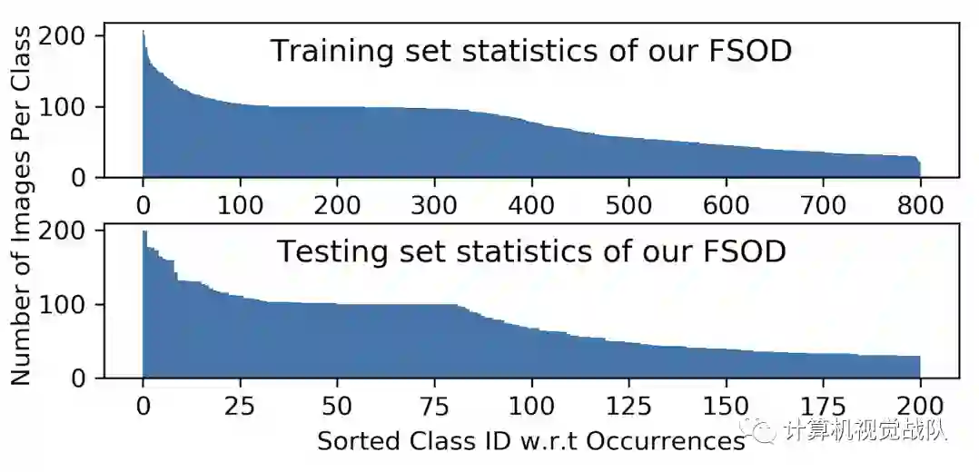 数据集是专为几次学习和评估新颖类别模型的通用性而设计的,该模型包含1000个类别,分别用于训练和测试集的800/200分割,总共约66,000张图像和182,000个边界框。下表和下图显示了详细的统计信息。我们的数据集具有以下属性。