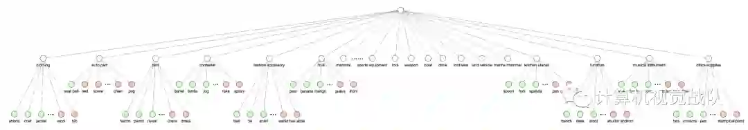包含了83中父类语义,例如哺乳动物,衣服,武器等,这些语义进一步细分为1000个叶子类别。我们的标签树如上图所示。由于严格的数据集划分,我们的训练/测试集包含了非常不同的语义类别的图像,因此给要评估的模型带来了挑战。