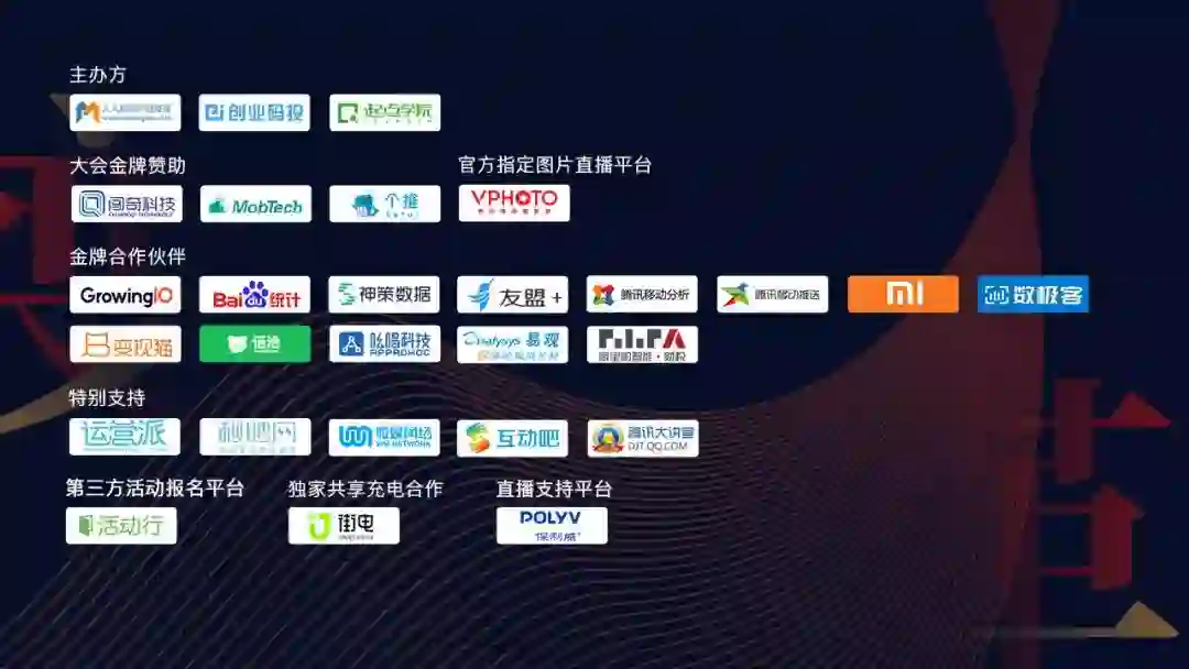 感谢金牌合作伙伴闯奇科技、个推、MobTech等各位金主爸爸们的支持: