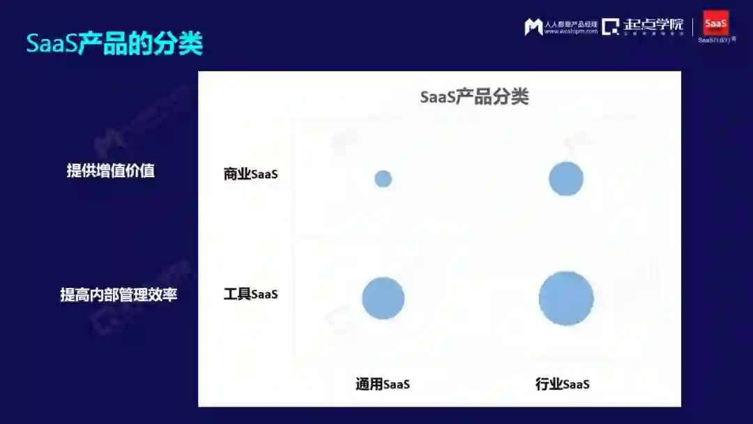 从两个维度进行分类,横向分为通用 SaaS 和行业 SaaS,纵向分为商业 SaaS 和工具 SaaS,里面的圆圈代表目前大概的公司数目。