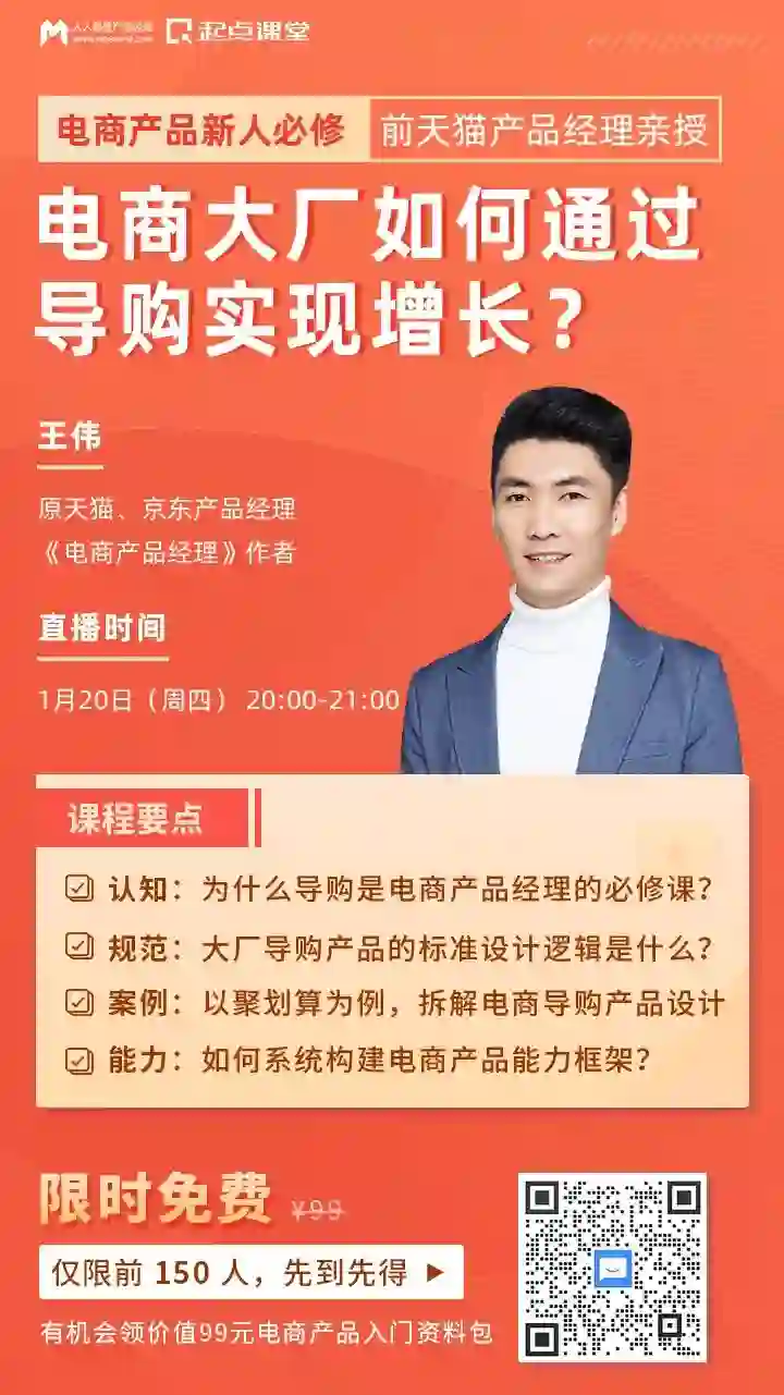 为了解决这些问题,帮助0-3岁电商产品经理可以更快入门成长,1月20日(周四)晚8点,人人都是产品经理&起点课堂邀请前天猫/京东产品经理、畅销书《电商产品经理》作者王伟老师,准备了这次直播公开课。