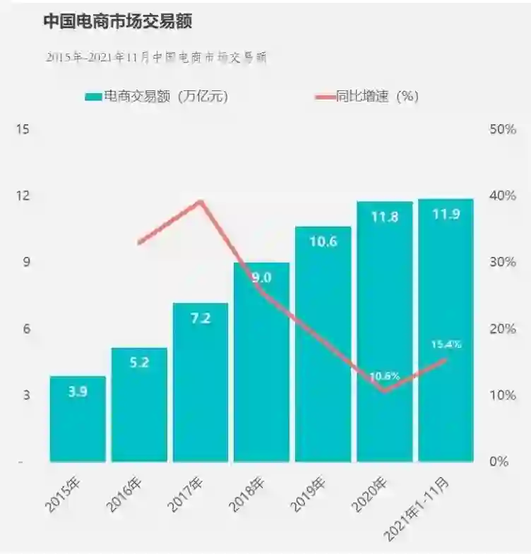 根据Fastdata极数的最新报告,2021年仅1-11月,中国电商市场交易额就达到了 11.9万亿 元,同比增长 15.4%。其中实物商品电商交易额占社会消费品零售总额比重更是达到了 31.9%,而且还在持续快速增长中。
