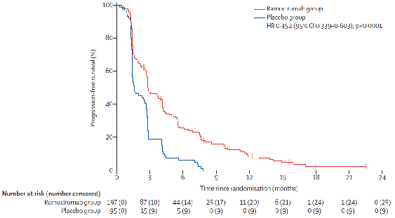 REACH-2是一项随机、双盲、安慰剂对照的Ⅲ期临床研究,在20个国家的92家医院、诊所和医学中心进行。入组标准包括:≥18岁;组织学或细胞学确诊为肝细胞癌;如无组织学诊断结果,则具有肝硬化和肝细胞癌的经典影像学特征亦可;巴塞罗那临床肝癌分期B或C期;Child-Pugh A级;东部肿瘤协作组(ECOG)体力状态评分0或1分;AFP≥400 ng/ml;先前只接受过索拉非尼治疗。