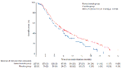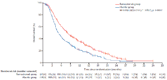 入组患者按2∶1随机给予雷莫芦单抗8 mg/kg每2周1次,或安慰剂,治疗至疾病进展、出现不可接受的毒性反应或撤回知情同意书。所有患者都接受最佳支持治疗。主要研究终点为总生存期。次要研究终点包括无进展生存、获得客观缓解的患者比例、至影像学确诊的进展时间、安全性、至癌症治疗功能评价系统之肝胆量表8(FHSI-8)评分恶化的时间、至ECOG体力状态评分恶化的时间。疗效分析在意向性治疗人群中进行,安全性分析在所有接受了至少一次研究药物治疗的患者中进行。