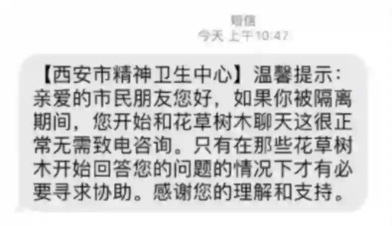 今年年初,社交媒体上曾流传一张西安市精神卫生中心的短信截图,上面写到:“隔离期间,您如果和花草树木聊天这很正常无需致电咨询,只有在那些花草树木开始回答您问题的情况下才有必要寻求协助。”