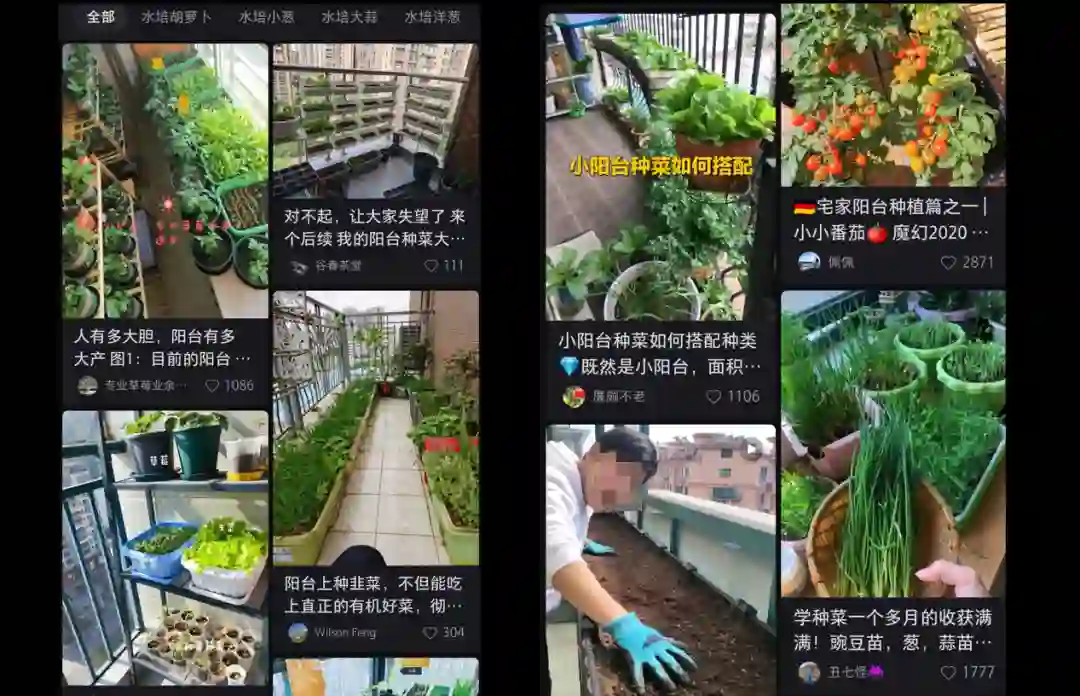 小红书上以“阳台种菜”为关键词,能检索到4万余篇笔记,比“阳台种花”多出一倍。抖音上输入“阳台”二字,匹配的首个词条即是种菜,#居家的尽头是种菜#话题,登上抖音4月18日热榜。