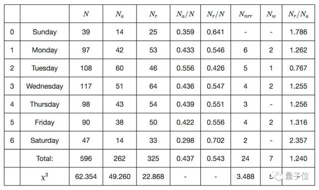 前五列数据分别是投稿总数、接收篇数、拒稿篇数、接收率和拒稿率。可以看出,周三投稿是最多的,周末基本上少了一半。