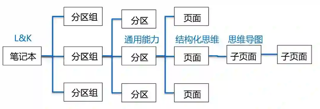 OneNote笔记包括了笔记本、分区组、分区,页和子页,这是一个逐层包容的关系: