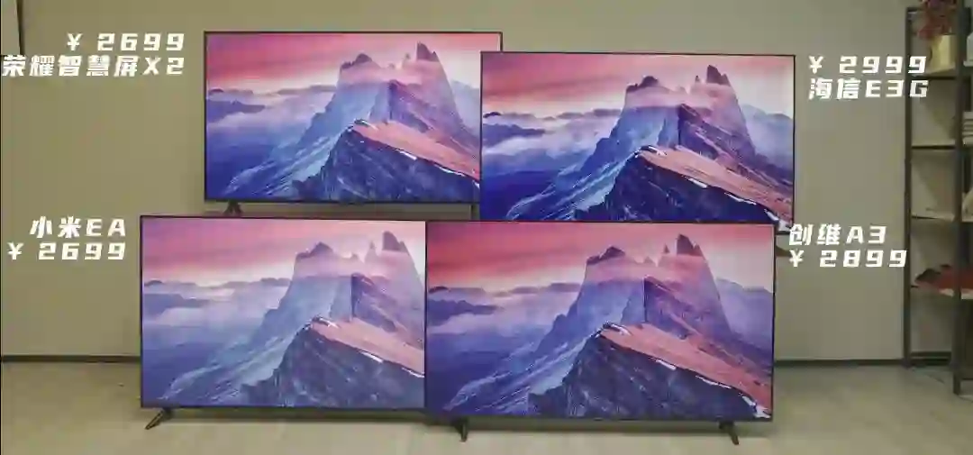 这期电视横评主要集中在厮杀激烈的 3000 元以下价格区间,四台选品都是 65 英寸,分别是小米 EA,创维 A3,荣耀智慧屏 X2,海信 E3G 系列,因为售价和成本的缘故,跑量的畅销型号并不像旗舰电视一样疯狂堆料,能做到面面俱到,那厂家们会在哪些方面做取舍,而除了面板尺寸芯片那些,背后有什么隐性差异,能影响到用户的使用体验。
