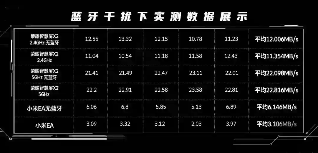 每款产品我们都测 5 次取平均值,在无明显遮挡的情况下,2.4GHz 网络下网速最佳的是创维 A3,荣耀智慧屏 X2 紧随其后,小米 EA 和海信 E3G 都仅有前者一半左右的网速,还不及手机4G网络的速度,而荣耀智慧屏 X2 切换到 5GHz 频段之后,平均网速接近翻倍,平均达到了 22MB/s,在这种速率下,即使是非常高清的在线视频资源,也不在话下。
