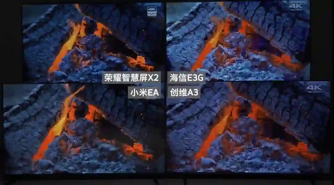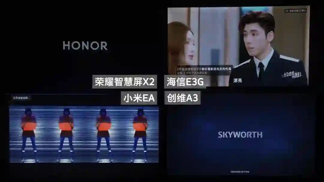 四台电视的处理芯片用的都是能效比较高的 Cortex-A 系列,售价较高的创维 A3 用的芯片最好,荣耀智慧屏 X2 和海信用的都是 A53,小米 EA 次之,内存方面小米 EA 和海信 E3G 一致,都是 1.5GB 运存+8GB 的配置,荣耀智慧屏 X2 和创维 A3 都是 2+16GB,大家看大片时都够用,不会卡顿,运行起来差距也不大。