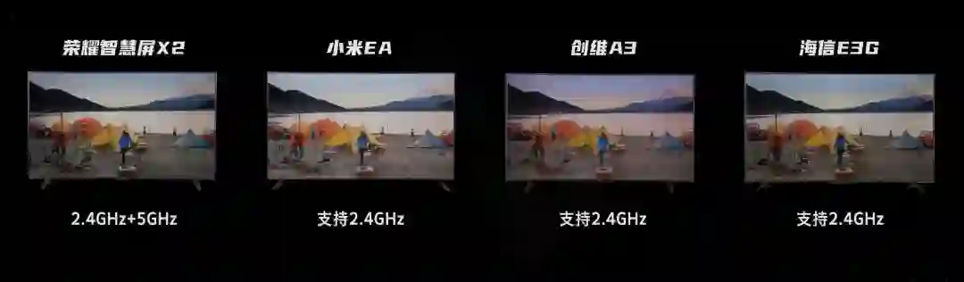 而前面说到的电视短距传输性能,配置最好的是荣耀智慧屏 X2,其他 3 款网络都只支持 2.4GHz,而荣耀智慧屏 X2 使用的是 MT7668AU 芯片,支持速率更高的 802.11ac 协议的 WIFI5,也就是能使用 2.4GHz+5GHz 双频段,虽然是 2*2MIMO 的天线,但纸面参数也比其他三位选手强劲很多,能支持 DBDC 双频并发处理,在路由和网速不成瓶颈的情况下,这四位的短距传输性能会有多大差异呢?